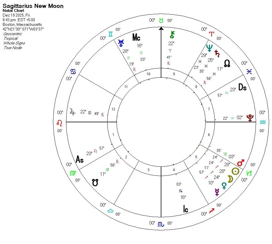 We take the salty with the sweet at the New Moon at 28°25 Sagittarius at 8:43PM ET on December 19, 2025, that is in conjunction with Venus and a square with Saturn and Neptune in Pisces. The last lunation of the year, this dark moon at the darkest time bids us to renew our faith in something we can't see or touch but believe can help get us through.