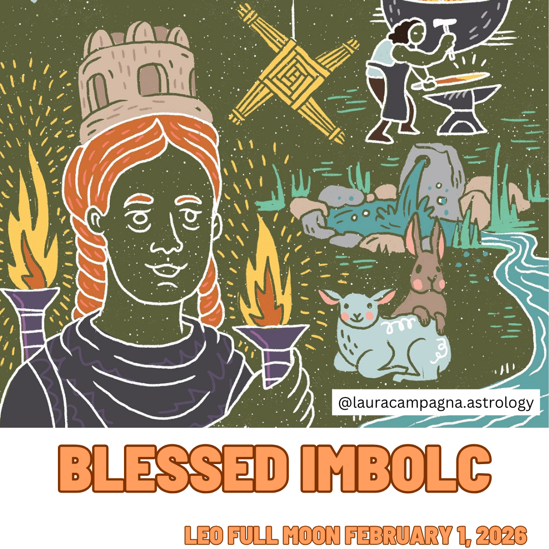 The Full Moon at 13°04 Leo at 5:09PM ET on February 1st, illuminates the mid-Winter festival of Brigid, the bright one, Celtic goddess of poetry, inspiration, fires of the forge, home and hearth, protection, midwives and fertility, and healing waters and wells.