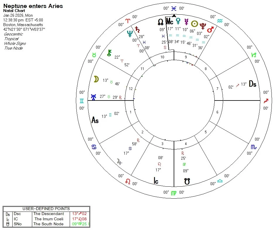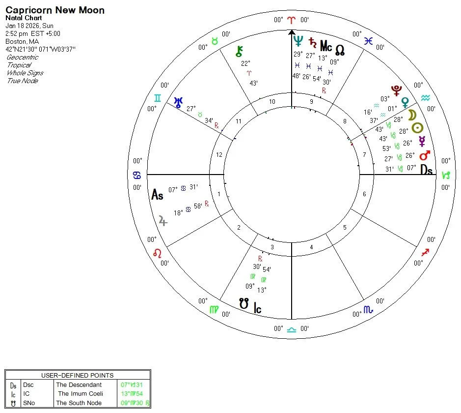 Our relationship with time is illuminated by Saturn-Neptune final days of sailing the eternal seas of Pisces. Neptune moves into Aries on January 26, 2026, where it will stay until March 2038! Neptune has expanded our consciousness towards the subtle, spiritual, and timeless realms since 2011. It's influence on this lunation in Capricorn invokes the need to stay connected with the imaginal realm of dreams and possibilities as we seek to make concrete changes in the world. Where are we doing too much or too little and how can we imagine a more generative flow this year?