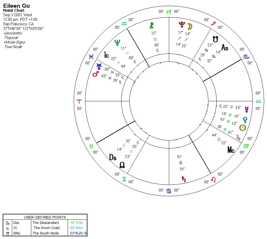 Gu herself is the perfect astro talisman to combat this energy. She holds both the skill and dexterity of Virgo with the wisdom of Pisces. Gu was born on September 3, 2003, in San Francisco, CA with Mars and Uranus conjunct in Pisces opposite a Virgo stellium (her birthtime is unknown so we don't know her ASC). Gu has the Sun, Venus, Jupiter, and Mercury retrograde all in Virgo. It is no surprise that she has been able to accomplish a successful career skiing and modeling while also attending Stanford. She was able to name herself as the most decorated female freeskier in the world and the hard work and talent that takes while sounding grounded and grateful for where she is.