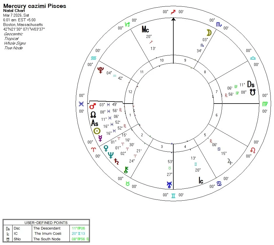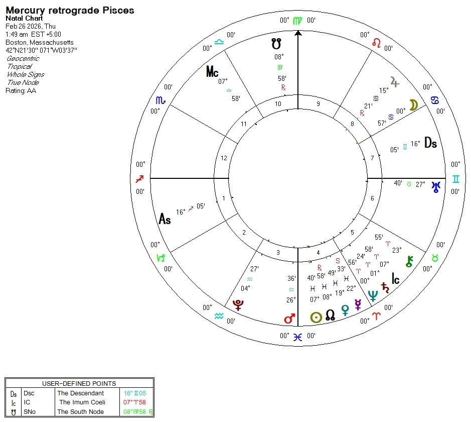 Pisces is considered a "mute" sign because it can have trouble sharing thoughts and feelings. Trust is the basis of intimacy but identifying exactly what that means can be difficult to identify. We should gain insight into what that means at the peak of the cycle when Mercury goes cazimi at 16°53 Pisces on March 7. If you have planets or points within three degrees then this retrograde is going to affect you more intensely. Mercury stations direct on March 20, and departs its post-shadow on April 9th.